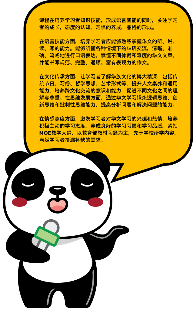 Hua Xia trains learners to proficiently master listening, speaking, reading, and writing in Chinese. The curriculum, aligned with the MOE syllabus, ensures that learners can understand Chinese communication in various contexts, express themselves clearly and fluently, comprehend texts of different styles and difficulty levels, and write well-structured, coherent, and expressive essays.